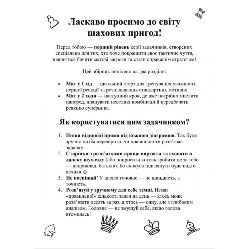 Перед тобою — перший рівень серії задачників, створених спеціально для тих, хто хоче покращити своє тактичне чуття, навчитися бачити матові загрози та стати справжнім стратегом!