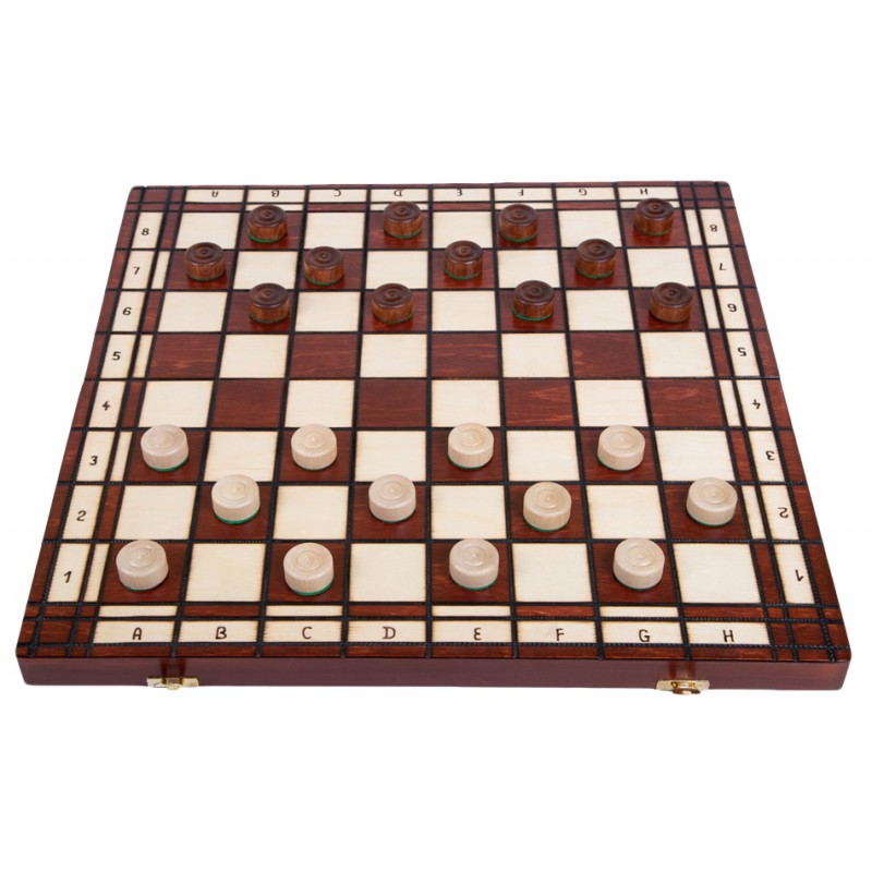 Комплект також включає шашкові фішки, які підходять за розміром до клітин дошки. Вони мають зручну форму та оптимальну вагу, що дозволяє легко маніпулювати елементами під час гри. Контрастні кольори шашок забезпечують чітке розрізнення сторін, полегшуючи сприйняття стратегічної ситуації та контроль над ігровим процесом.