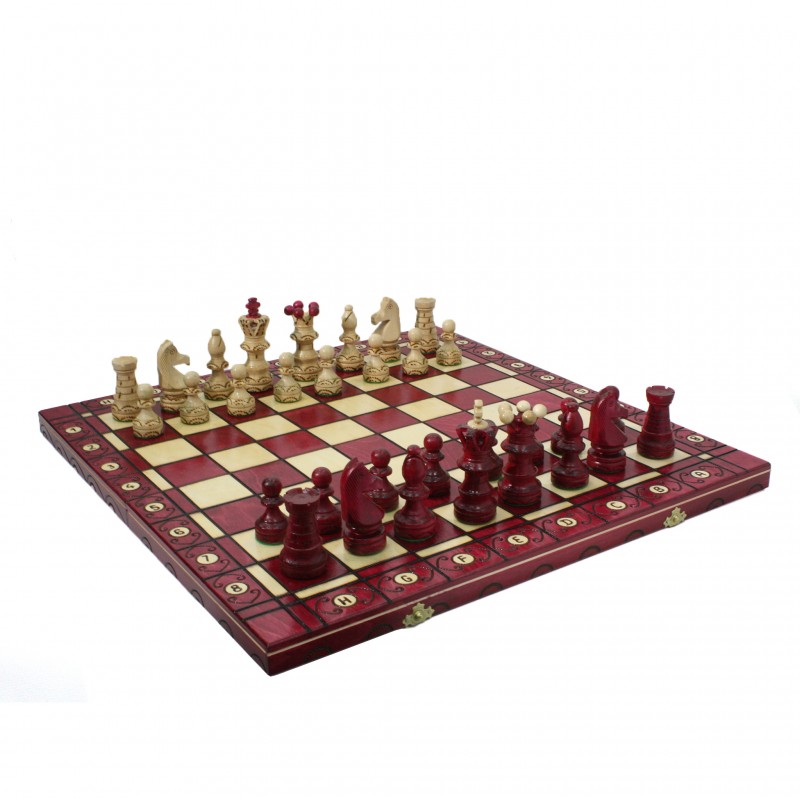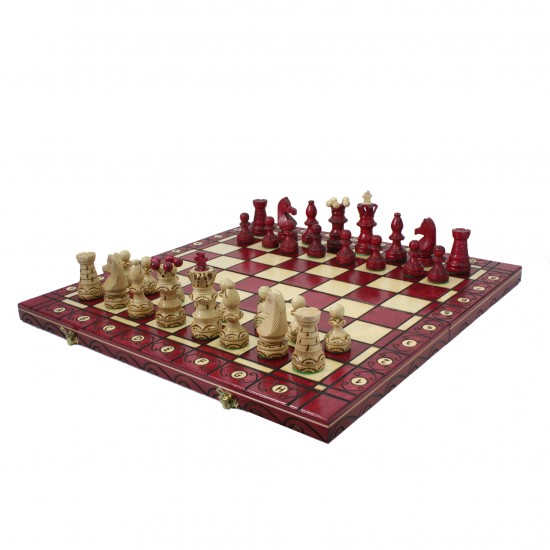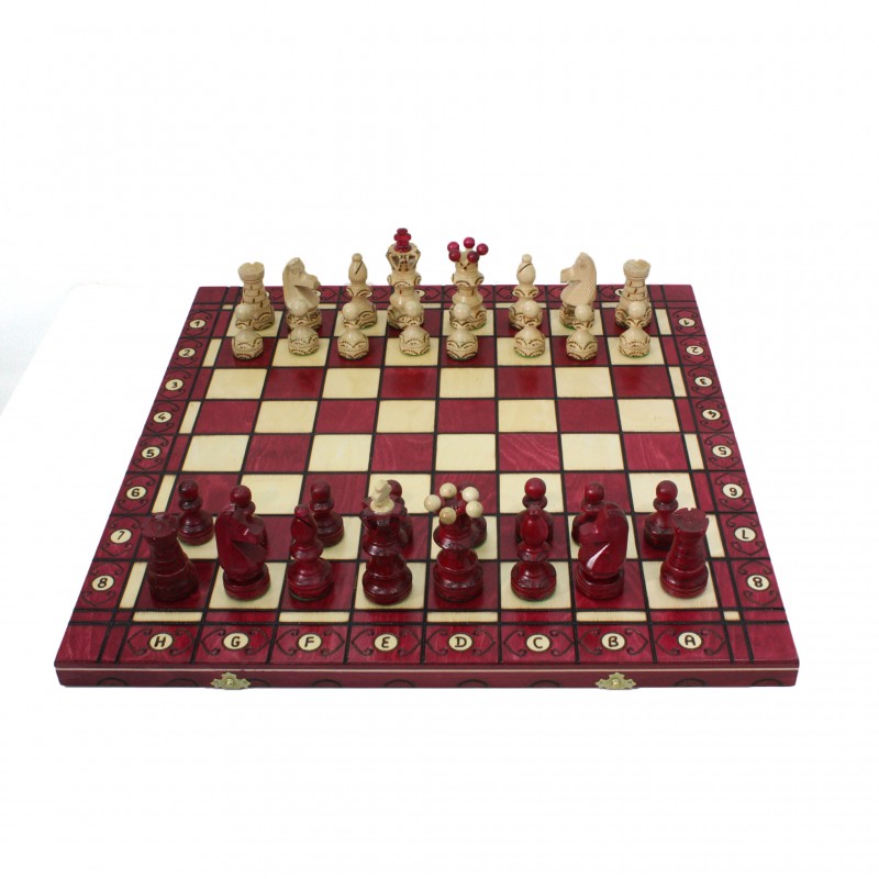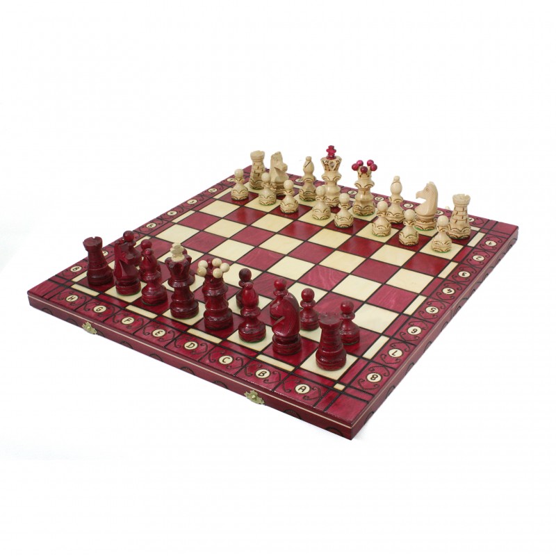 Прекрасна шахова дошка виготовлена з дерева (бук, береза), що має оригінальне поєднання червоних і бежевих полів. Для зручного зберігання шахових фігур всередині дошки передбачені окремі осередки, оброблені зеленим оксамитом. Великі, красиві фігури з цільного дерева (граб, платан), які зручно тримати в руках. Знизу у кожної фігури приклеєний зелений повсть, який не допускає дряпання дошки під час гри.
