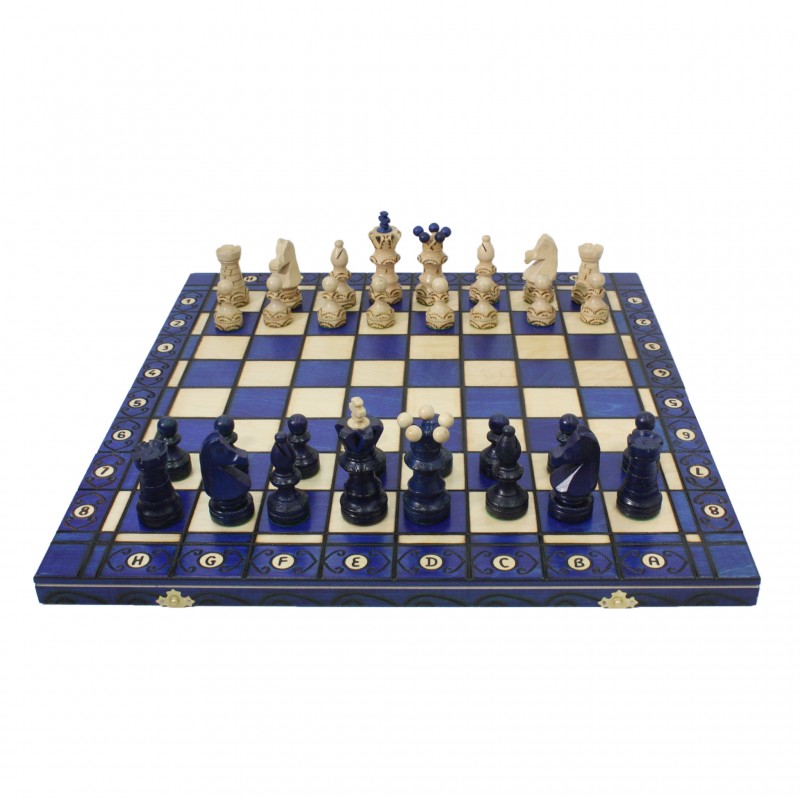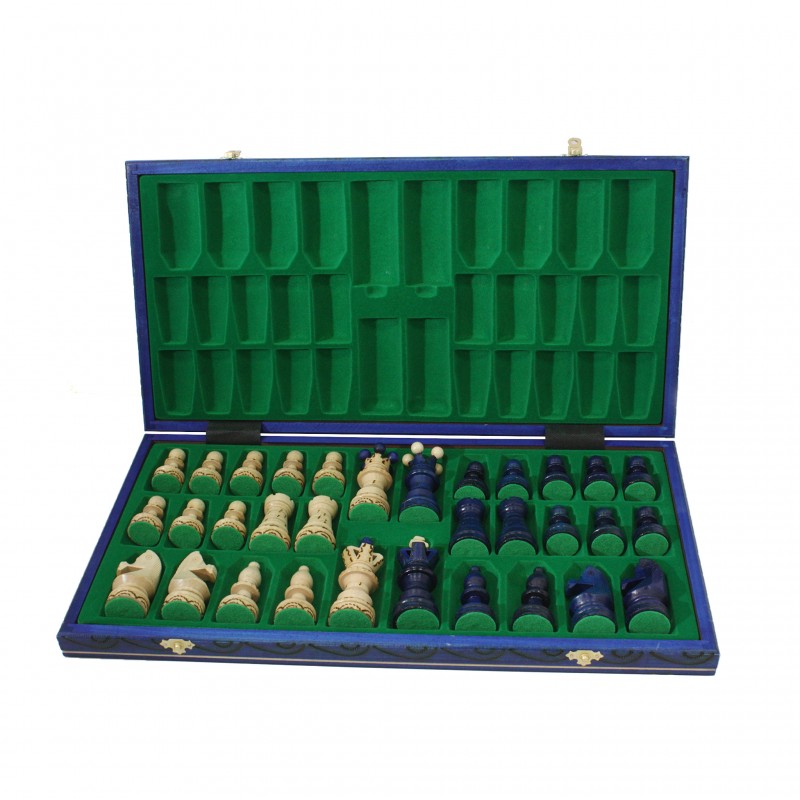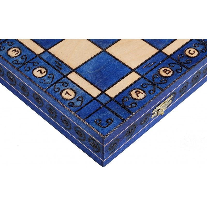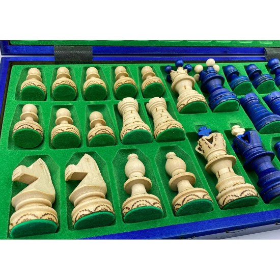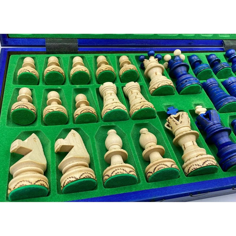 Прекрасна шахова дошка виготовлена з дерева (бук, береза), що має оригінальне поєднання синіх і бежевих полів. Для зручного зберігання шахових фігур всередині дошки передбачені окремі осередки, оброблені зеленим оксамитом. Великі, красиві фігури з цільного дерева (граб, платан), які зручно тримати в руках. Знизу у кожної фігури приклеєний зелений повсть, який не допускає дряпання дошки під час гри.