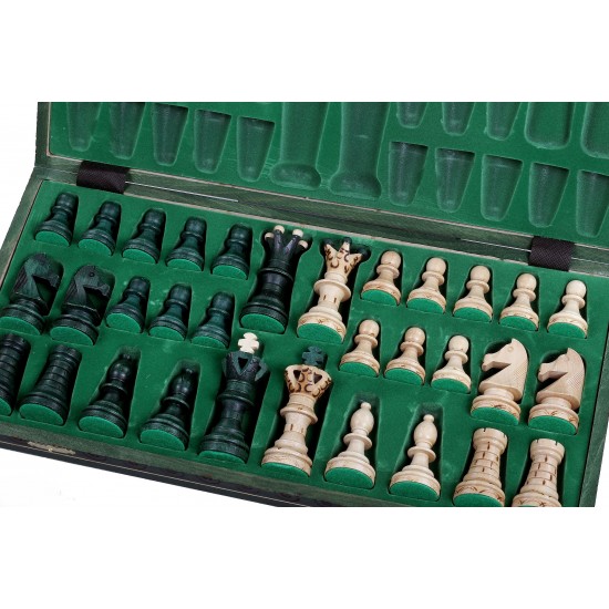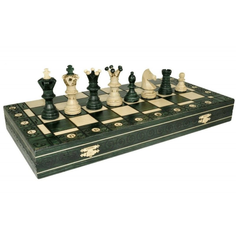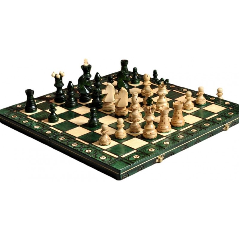 Прекрасна шахова дошка виготовлена з дерева (бук, береза), що має оригінальне поєднання зелених і бежевих полів. Для зручного зберігання шахових фігур всередині дошки передбачені окремі осередки, оброблені зеленим оксамитом. Великі, красиві фігури з цільного дерева (граб, платан), які зручно тримати в руках. Знизу у кожної фігури приклеєний зелений повсть, який не допускає дряпання дошки під час гри.