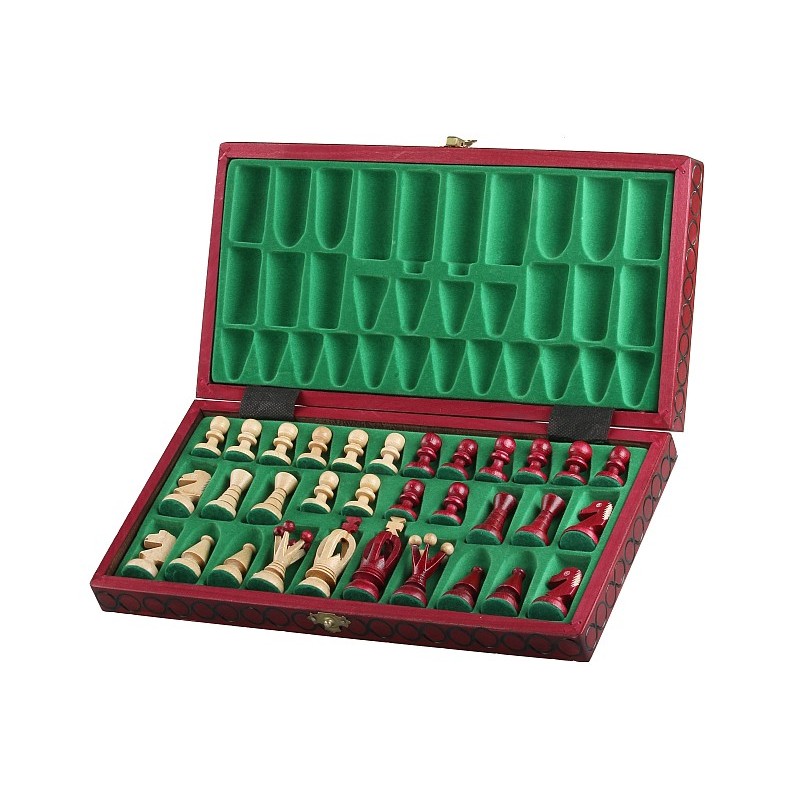 Шахи "Королівські середні" виготовлені вручну польськими майстрами. Вони привертають увагу своїм унікальним виглядом і розкішним червоним кольором. Дерев'яні фігури, форма яких досить незвичайна і цікава, можна акуратно скласти всередині дошки в спеціальні осередки, тим самим забезпечити їх збереження від пошкоджень. Кожна з фігур має на підставі оксамитову тканину для кращого ковзання по дошці. Дошка розміром 350мм х 350мм також виготовлена з дерева з елементами випалювання, саме елементи випалювання надають дошці особливу привабливість. Дошка виготовлена з бука та берези, фігури-з клена.