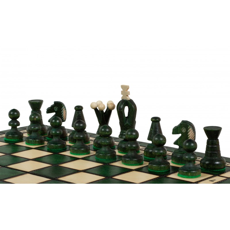 Шахи "Королівські середні" виготовлені вручну польськими майстрами. Вони привертають увагу своїм унікальним виглядом і чудовим зеленим кольором. Дерев'яні фігури, форма яких досить незвичайна і цікава, можна акуратно скласти всередині дошки в спеціальні осередки, тим самим забезпечити їх збереження від пошкоджень. Кожна з фігур має на підставі оксамитову тканину для кращого ковзання по дошці. Дошка розміром 350мм х 350мм також виготовлена з дерева з елементами випалювання, саме елементи випалювання надають дошці особливу привабливість. Дошка виготовлена з бука та берези, фігури-з клена.