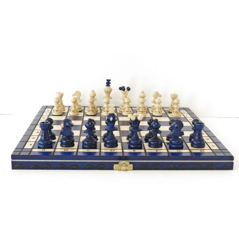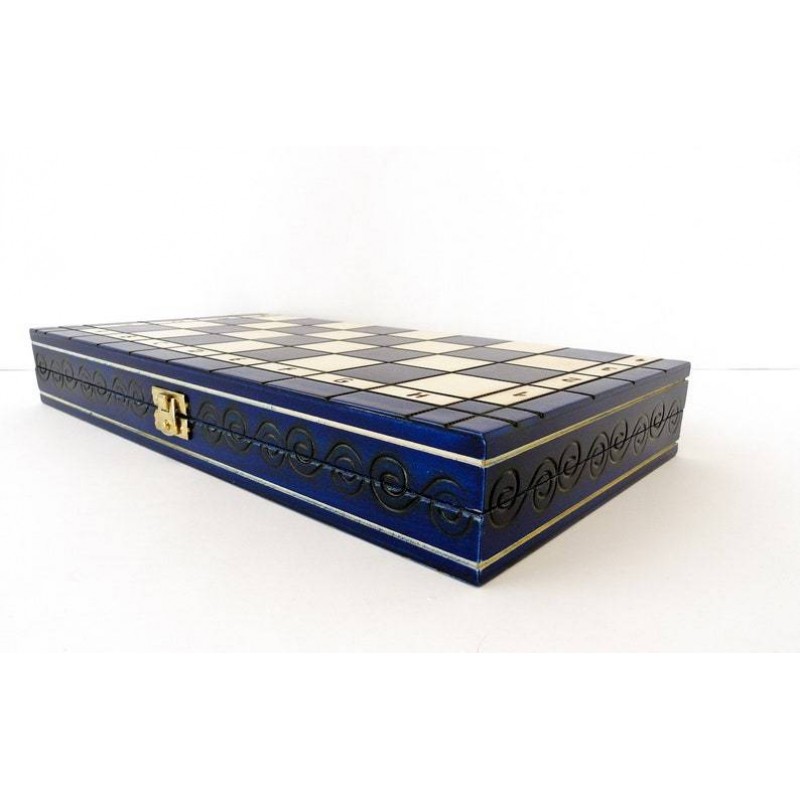 Шаховий набір Перлина середня відрізняється незвичайним і лаконічним дизайном і являє собою якісний дерев'яний набір, який майстерно виготовлений вручну польськими майстрами. Особливої уваги заслуговує благородний синій колір набору. Орнамент на фігурах прекрасно поєднується з витонченою формою. Підставу шахових фігур покрито зеленою повстю, що сприяє їх гарному ковзанню при грі і запобігає дряпанню дошки. Дошка і фігури ретельно відшліфовані і покриті багатошаровим лаком. Розмітка на дошці нанесена методом випалювання. Для надійного зберігання дошки в складеному стані, застосовується мідна застібка.