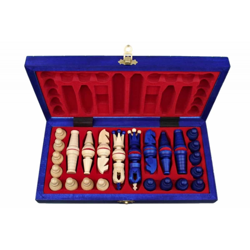 Ексклюзивний шаховий набір "Royal maxi", виготовлений провідним польським виробником шахів Madon з високоякісної деревини в оригінальному синьому кольорі. Дошка виготовлена з дерева-бук і карельська береза, а шахові фігури з-граба та бука. Завдяки компактним габаритам, набір можна використовувати як дорожній. Дошка легко складається і швидко перетворюється в зручний контейнер, з червоними оксамитовими осередками всередині, для зручного зберігання фігур. Шахові фігури і дошка, виготовлені з елементами випалювання і ручної різьби, підкреслять особливий смак свого власника, і стануть чудовим елементом декору вашого будинку або дозволять насолоджуватися улюбленою грою у відпустці або в подорожі.