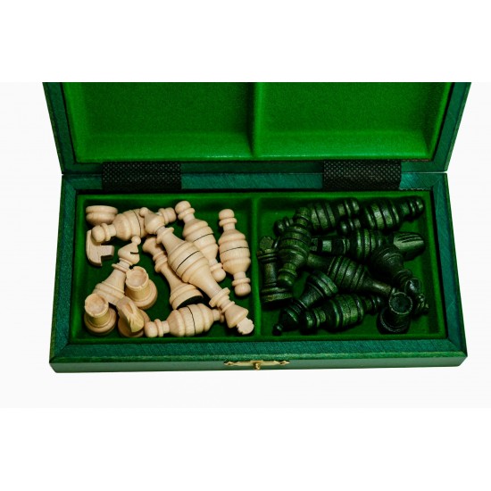 Цей маленький і компактний ігровий набір, елегантного зеленого кольору - ідеальне рішення для тих, хто любить грати під час подорожей, їхній розмір дозволяє легко покласти в сумку або рюкзак. Висока якість виконання та традиційний дизайн порадують кожного шанувальника цієї захоплюючої настільної гри.