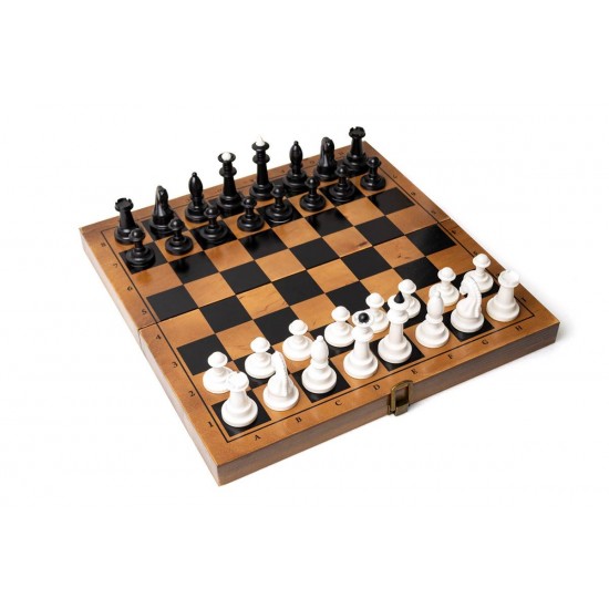 У комплект входять класичні пластикові шахові фігури, які чудово виглядають на ігровому полі. Підстава шахових фігур покрита м'якою тканиною, для плавного ковзання по дошці. Фігури акуратно і компактно вкладаються в шахову дошку.