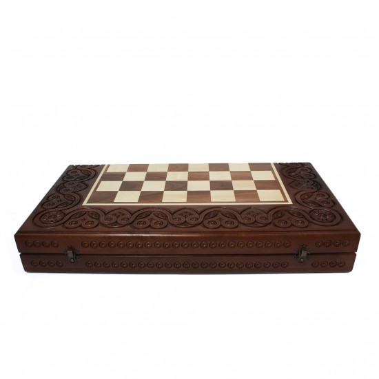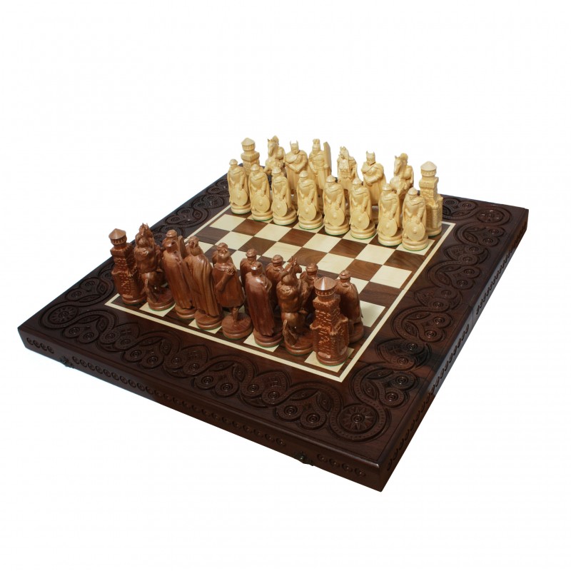 Шахова дошка та фігури виготовлені з натурального дерева горіх. Фігури майстерно вирізані вручну у вигляді середньовічних лицарів, з увагою до найменших деталей — від шоломів до мечів і щитів. Кожна фігура — це маленька скульптура, яка ніби зійшла зі сторінок легенд про Камелот. І фігури, і дошка вкриті багатошаровим лаком, що підкреслює природну красу дерева та забезпечує надійний захист поверхні. Основи фігур обтягнуті фетровою тканиною, що запобігає подряпинам та забезпечує м’яке й безшумне пересування по дошці.