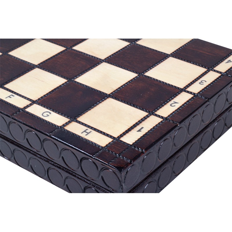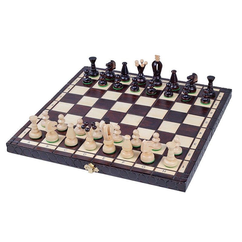 Шахи "Королівські середні" виготовлені вручну польськими майстрами. Вони привертають увагу своїм унікальним виглядом. Дерев'яні фігури, форма яких досить незвичайна і цікава, можна акуратно скласти всередині дошки в спеціальні осередки, тим самим забезпечити їх збереження від пошкоджень. Кожна з фігур має на підставі оксамитову тканину для кращого ковзання по дошці. Дошка розміром 350мм х 350мм також виготовлена з дерева з елементами випалювання, саме елементи випалювання надають дошці особливу привабливість. Дошка виготовлена з бука та берези, фігури-з клена.
