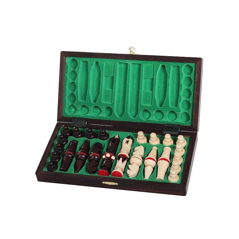Ексклюзивний шаховий набір "Royal maxi", виготовлений провідним польським виробником шахів Madon з високоякісної деревини. Дошка виготовлена з дерева-бук і карельська береза, а шахові фігури з-граба та бука. Завдяки компактним габаритам, набір можна використовувати як дорожній. Дошка легко складається і швидко перетворюється в зручний контейнер, з червоними оксамитовими осередками всередині, для зручного зберігання фігур. Шахові фігури і дошка, виготовлені з елементами випалювання і ручної різьби, підкреслять особливий смак свого власника, і стануть чудовим елементом декору вашого будинку або дозволять насолоджуватися улюбленою грою у відпустці або в подорожі.