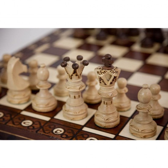 Сувенірні шахи Амбасадор, від польського виробника Wegiel, виготовлені з високоякісної, ретельно обробленої, екологічно чистої деревини (бук, береза). Оригінальні шахи ручної роботи, з елементами різьблення та випалювання, виконані у класичному стилі.