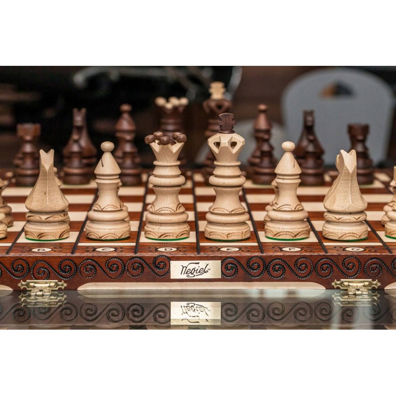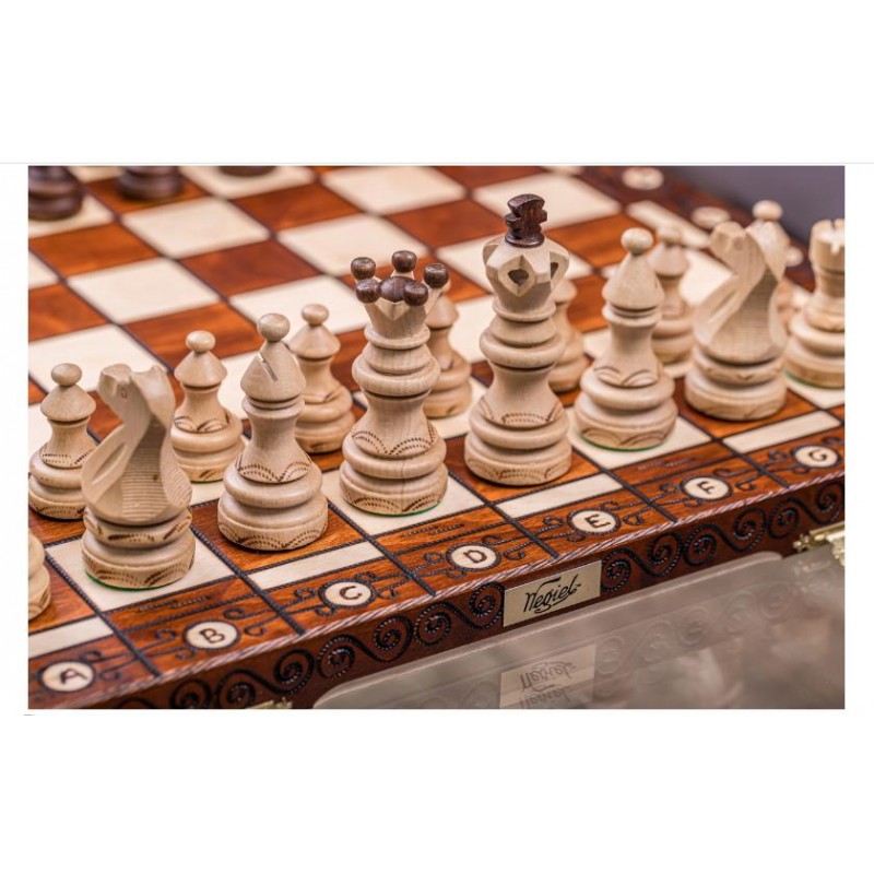 Оригінальний шаховий набір Імператор – ручна робота польських майстрів, відомого бренду преміум-сегменту Wegiel. Шахова дошка виготовлена з бука та берези, фігури-з платана та граба. Дошка майстерно вирізана з елементами випалювання.