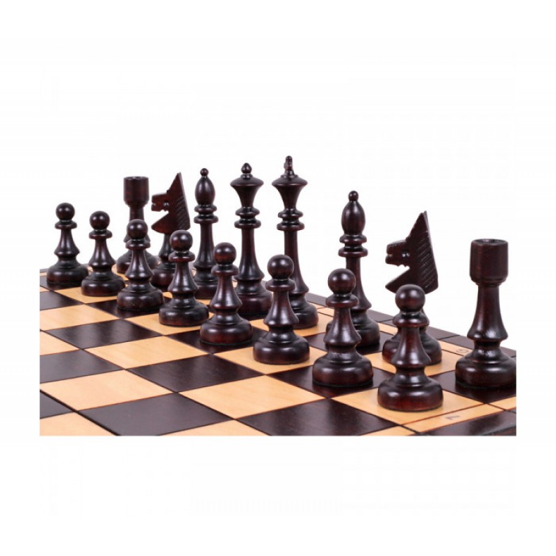 Шаховий набір Клубні - шахи ручної роботи польських майстрів які виготовлені в класичному стилі. Зроблені з високоякісного дерева (граб і карельська береза). Фігури майстерно вирізані, відшліфовані і покриті багатошаровим лаком. Підставу фігур покрито зеленою повстю, що сприяє кращому ковзанню по дошці і не пошкоджує її. Шахова дошка, також виготовлена з дерева, прикрашена елементами випалювання. Складна дошка оснащена зручними замками і має гарне поєднання темно-коричневих і світлих полів. Всередині дошки є оксамитова вкладка для акуратного складання фігур, що забезпечує їх дбайливе зберігання.