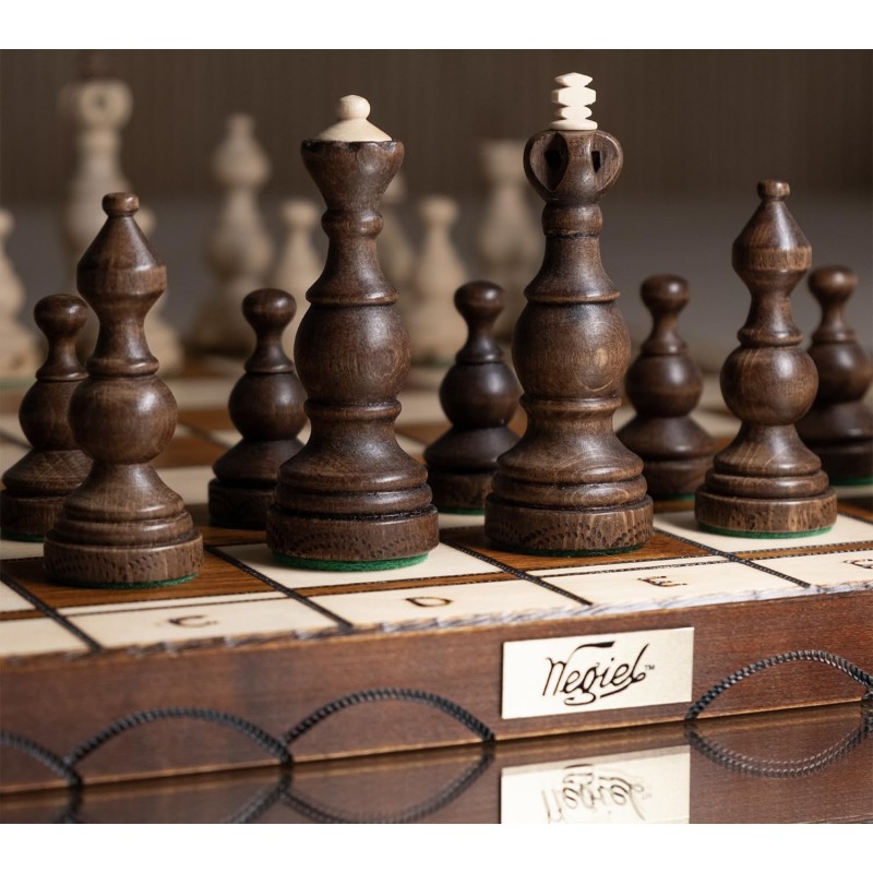 Оригінальний шаховий набір Legate – ручна робота польських майстрів, відомого бренду преміум-сегменту Wegiel. Шахова дошка виготовлена з бука та берези, фігури-з платана та граба. Дошка майстерно вирізана з елементами випалювання.