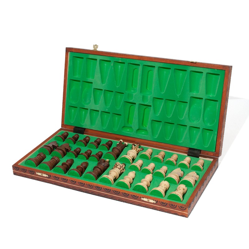Шаховий набір Royal, від польського виробника Wegiel, відрізняється оригінальним дизайном дошки та фігур. Фігури виконані з високоякісної деревини (граб та платан) з елементами випалювання, ретельно відшліфовані та покриті багатошаровим лаком. Дошка зроблена з деревини бука та берези, з елементами ручного різьблення та випалювання та має відповідну розмітку. Дошка легко складається і перетворюється на зручний контейнер для зберігання фігур, що забезпечує їх цілісність при транспортуванні. У складеному вигляді дошка надійно закривається за допомогою двох латунних застібок. Основа фігур покрита зеленою повстю, що запобігає пошкодженню унікальної ігрової дошки під час гри.