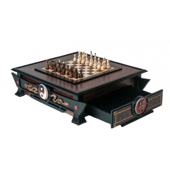 Особлива окраса столу — золоті дракони, майстерно вирізьблені вручну з клена. Вони символізують мудрість, могутність і захист. Їхнє розташування не випадкове — дракони ніби охороняють поле гри та надихають гравців на шлях до перемоги.