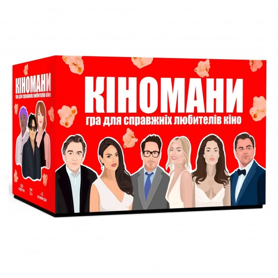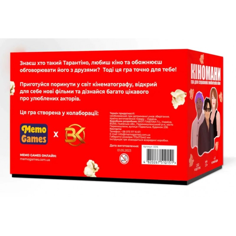 «Кіномани» - це настільна вікторина, яка перевіряє ваші знання відомих фільмів, змусить згадати цитати та ролі видатних акторів та кинути виклик друзям. Гра створена українським видавництвом Memo Games спільно з україномовним ютуб-каналом «Загін Кіноманів». Усі цитати у грі представлені українською, а комбінація трьох режимів завдань та особливого бонусного завдання для справжніх синефілів не дасть нудьгувати!