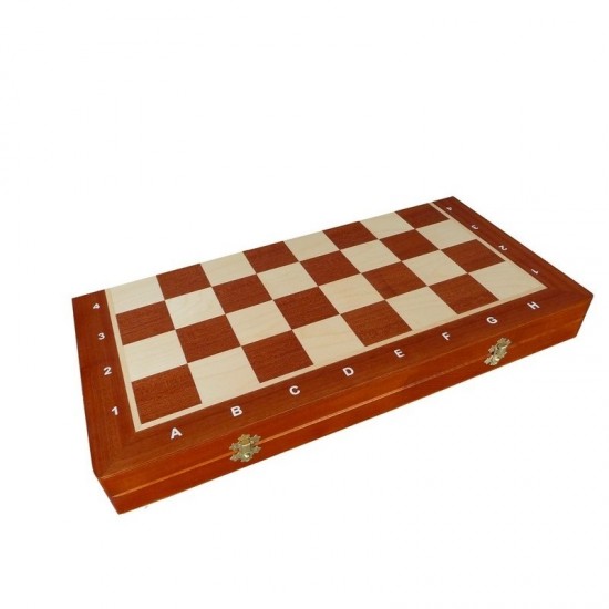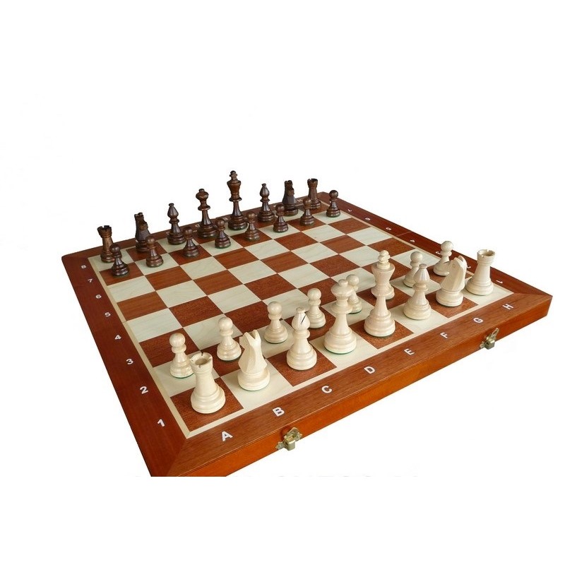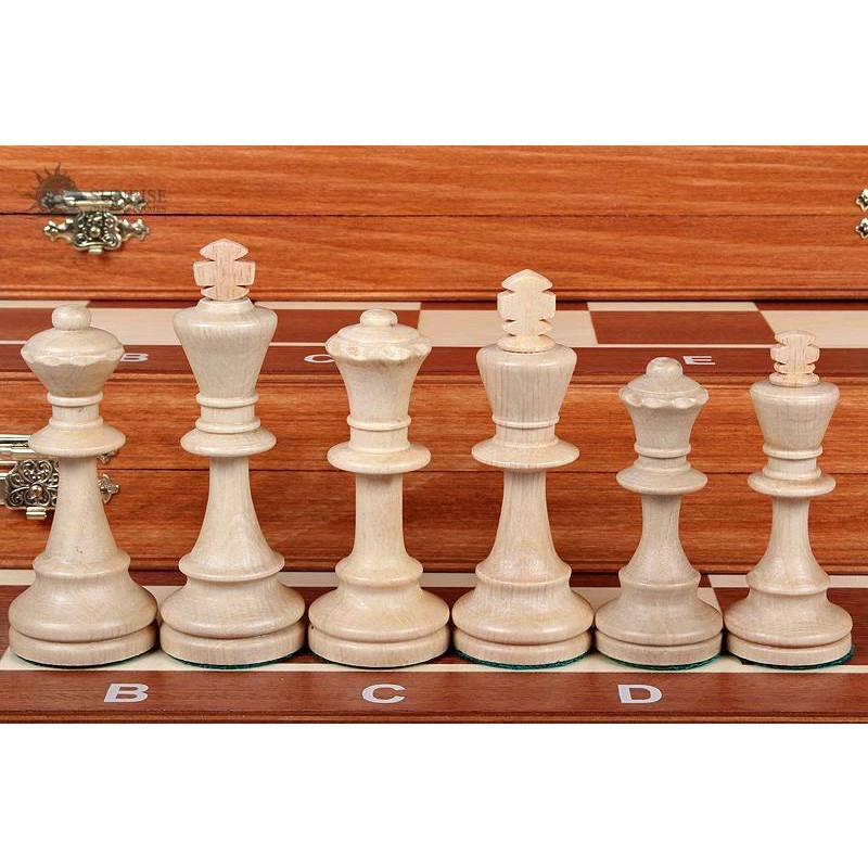 Комплект деревянных фигур большого размера и соответствующей игровой доски. Сдержанный классический дизайн фигур привлекает своей аккуратностью. Качество и строгое следование традициям этого польского производителя шахматной атрибутики, завоевало мировую славу. Доска сделана по технологии интарсия из высококачественных пород дерева . Фигуры идут с утяжелителем, что делает их устойчивыми на доске. Основание фигур покрыто зеленым войлоком, что способствует лучшему скольжению по доске и не царапает ее. Внутренняя поверхность доски представляет собой «персональные» ячейки для фигур, покрытые мягким зеленым фетром.