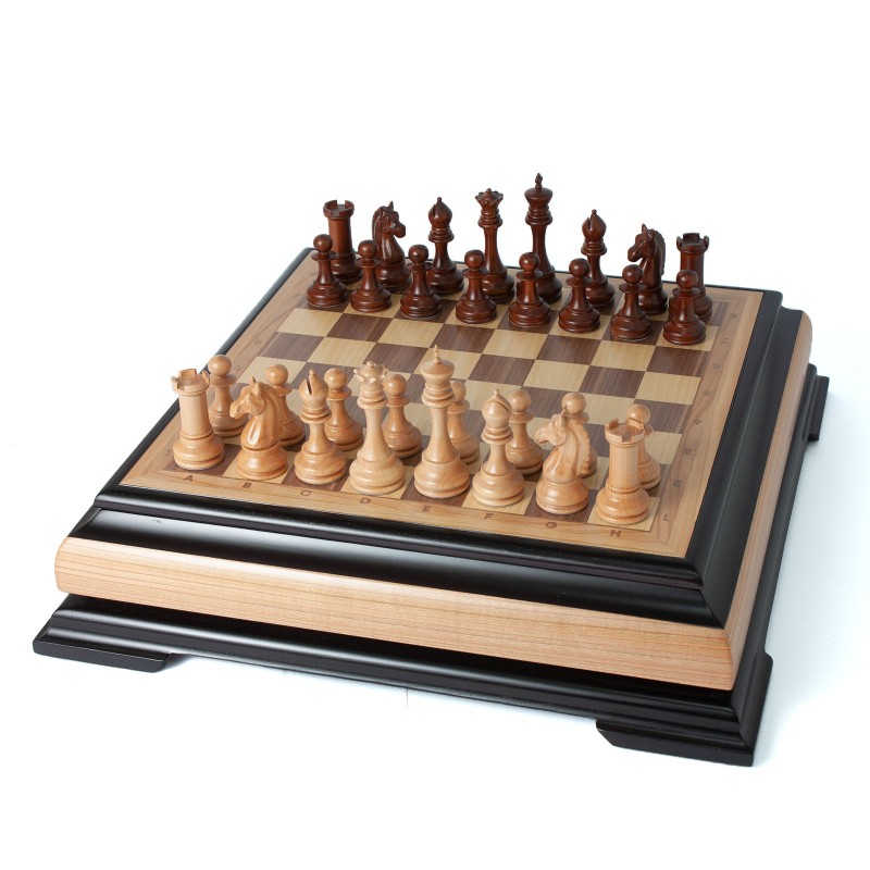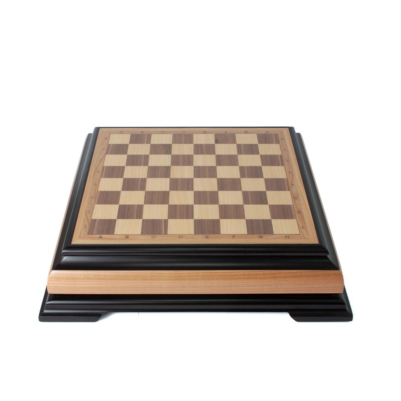 Доска изготовлена из натурального дерева. Игровые клетки выполнены из шпона ореха и ясеня, что создает выразительный контраст и обеспечивает комфортное восприятие во время игры. Боковые части и крышка украшены шпоном черешни, нижняя часть коробки сделана из ясеня, а внутренняя конструкция – из ольхи, что гарантирует прочность и долговечность изделия.