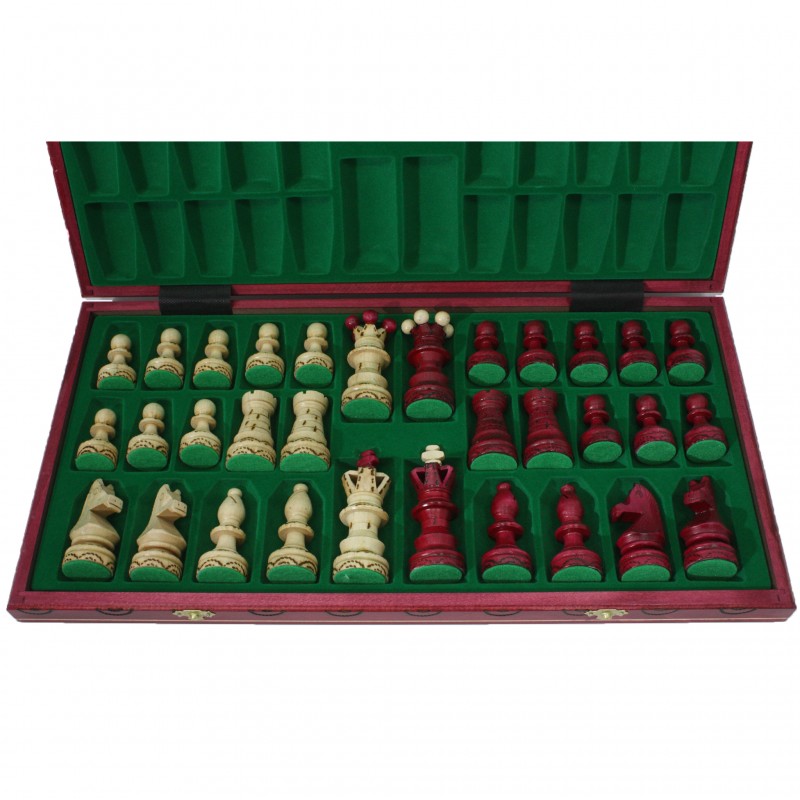 Прекрасная шахматная доска изготовлена из дерева (бук, береза), что имеет оригинальное сочетание красных и бежевых полей. Для удобного хранения шахматных фигур внутри доски предусмотрены отдельные ячейки, отделанные зеленым бархатом. Большие, красивые фигуры из цельного дерева (граб, платан), удобно держать в руках. Снизу у каждой фигуры приклеен зеленый войлок, который не допускает царапания доски во время игры.