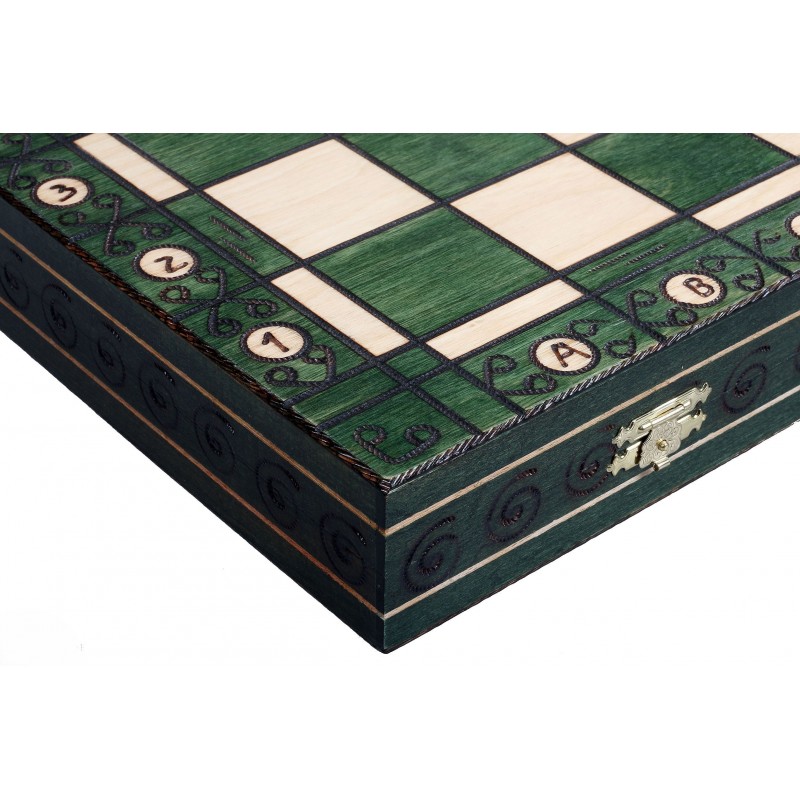 Прекрасная шахматная доска изготовлена из дерева (бук, береза), что имеет оригинальное сочетание зеленых и бежевых полей. Для удобного хранения шахматных фигур внутри доски предусмотрены отдельные ячейки, отделанные зеленым бархатом. Большие, красивые фигуры из цельного дерева (граб, платан), удобно держать в руках. Снизу у каждой фигуры приклеен зеленый войлок, который не допускает царапания доски во время игры.