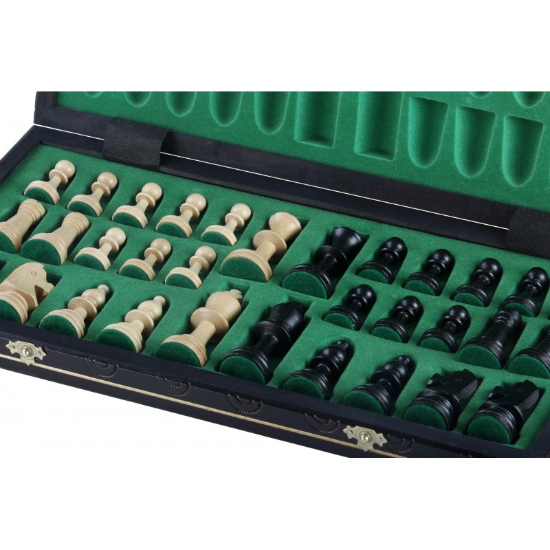 Снова польский производитель игровых шахмат Madon, подтвердил высокий профессионализм и европейское качество продукции, представив комплект под названием Consul в элегантном черном цвете.. Шахматная доска изготовлена из натурального дерева бук и березы, и украшена оригинальной резьбой с элементами выжигания. Она легко складывается и превращается в удобный контейнер для хранения фигур. Фигуры в свою очередь изготовлены из натурального дерева- граб, и дополнительно укомплектованы бархатной подкладкой, которая исключает повреждение доски во время игры. Фигуры выполнены в классическом стиле Стаунтона.