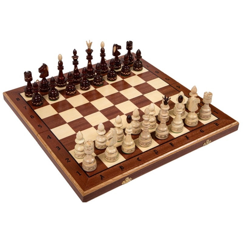 Подарочный набор ручной работы польских мастеров, производства Мадон. Фигуры выполнены в индийском стиле - вытянутые и заостренные к верху. Они изготовлены вручную из высококачественного дерева- граб. Основание фигур покрыто зеленым войлоком, что способствует лучшему скольжению по доске и не царапает ее.Доска изготовлена из качественной древесины- бук, береза, красное дерево и платан. Шахматная доска выполнена по технике интарсия -это когда два вида шпона светлый и темный вручную приклеиваются к доске и образуют игровые клетки. Шахматная доска складывается посередине, внутри отделана зеленой бархатной тканью и имеет отделения для удобного хранения фигур. На первый взгляд в этой модели бросается в глаза силуэт фигуры короля и ее высота- 120мм. Все фигуры тщательно отшлифованы , с идеально гладкой полированной поверхностью. Разметка на доске нанесена методом выжигания. Для надежного хранения доски в сложенном состоянии, применяются две медные застежки.