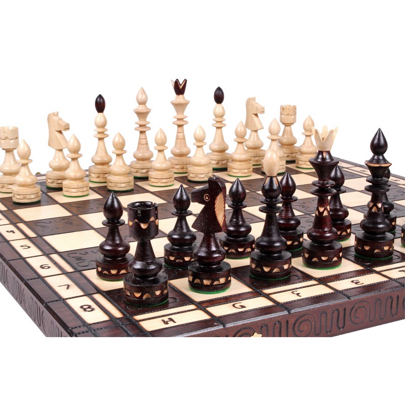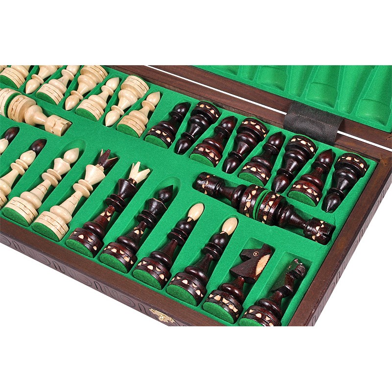 Шахматы "Индийские" большие - подарочный набор ручной работы польских мастеров, производства Мадон. Фигуры выполнены в индийском стиле - вытянутые и заостренные к верху. Они изготовлены вручную из высококачественного дерева- граб. Основание фигур покрыто зеленым войлоком, что способствует лучшему скольжению по доске и не царапает ее. Доска изготовлена из качественной древесины- бук и карельская береза. Разметка на доске нанесена методом выжигания, внутри доски находятся ячейки для каждой из фигур. Для надежного хранения доски в сложенном состоянии, применяются две медные застежки. Доска и шахматные фигуры изготовлены опытными мастерами своего дела, поэтому качество гарантировано.