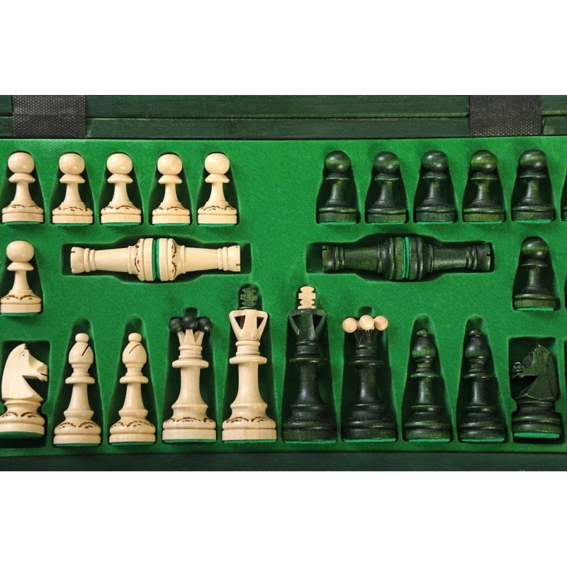 Шахматный набор Сенатор от польского производителя Мадон отличается оригинальным дизайном доски и фигур и изысканным зеленым цветом. Фигуры выполнены из высококачественной древесины (граб и платан) с элементами выжигания, тщательно отшлифованы и покрыты многослойным лаком. Доска сделана с элементами ручной резьбы и обжига и имеет соответствующую разметку. Доска легко складывается и превращается в удобный контейнер для хранения фигур, что обеспечивает их целостность при транспортировке. Основание фигур покрыто войлоком, что предотвращает повреждение уникальной игровой доски во время ожесточенного сражения.