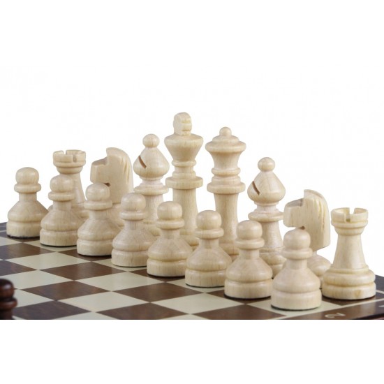 Фигуры изготовлены из граба, имеют небольшой размер и выполнены в классическом стиле. Основание фигур покрыто фетром, что предотвращает царапанье доски и способствует хорошему скольжению при игре. Доска и фигуры тщательно отшлифованы и покрыты многослойным лаком.