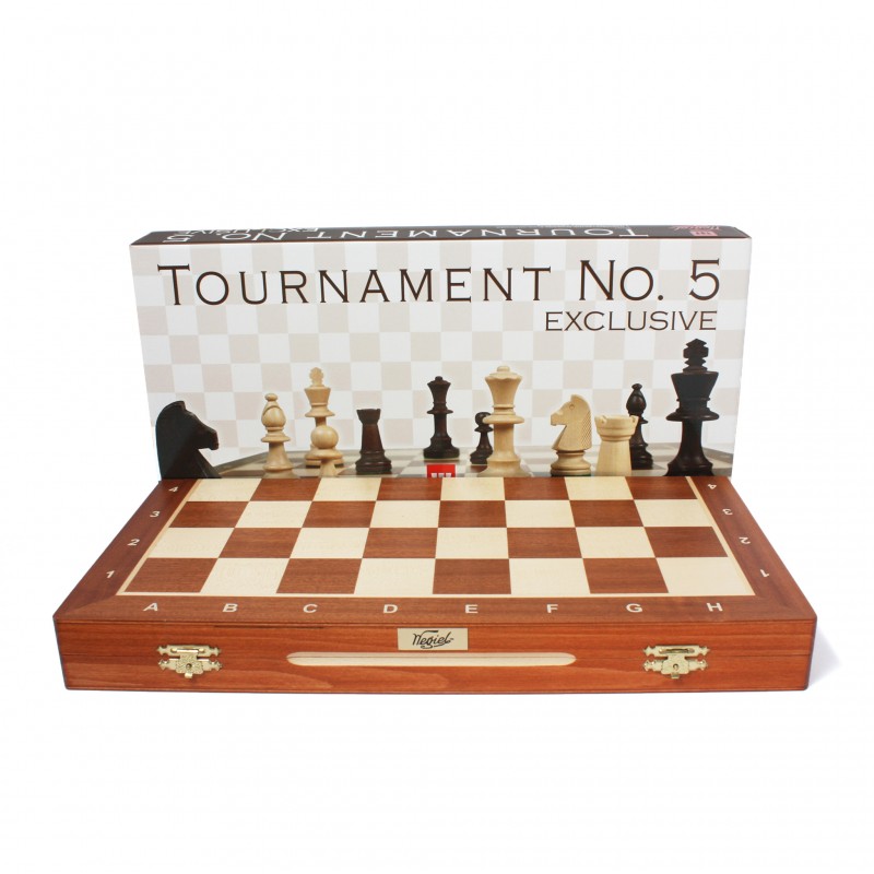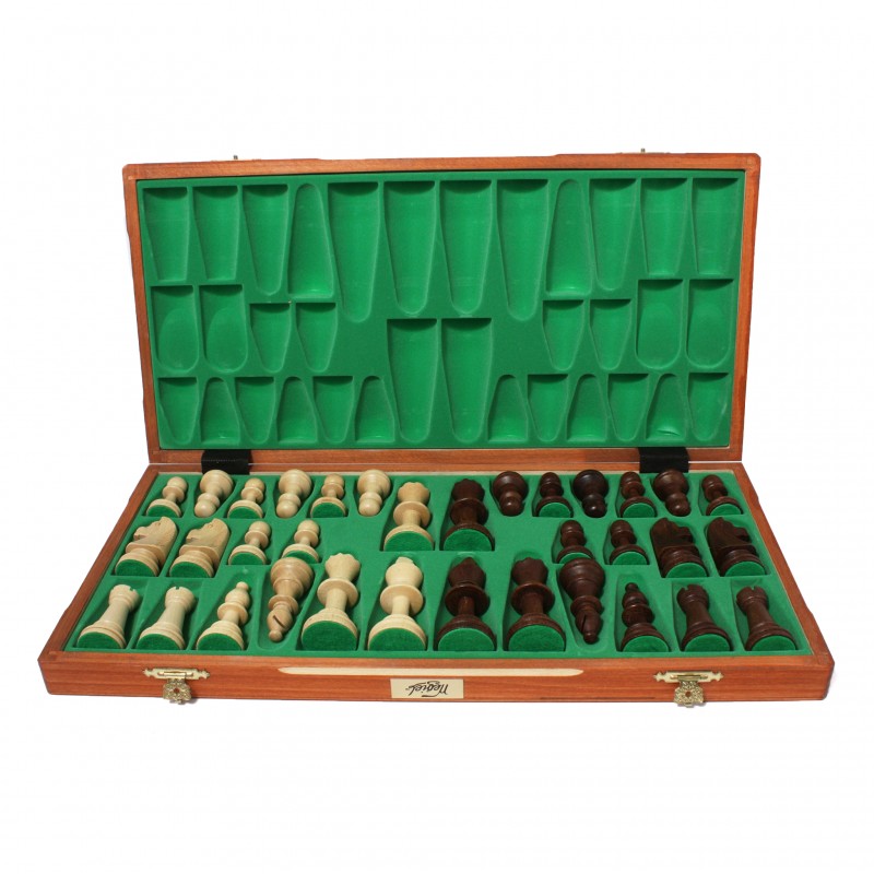 Шахматный набор Турнирные №5, изготовлены польским производителем Wegiel из нескольких видов высококачественного натурального дерева- бук, береза, красное дерево и явор. Доска сделана по технологии интарсия. Доска легко складывается и быстро превращается в удобный контейнер для шахматных фигур. По краям доски нанесена нумерация, пригодится при записи важных партий, или просмотра видеозаписи. Фигуры также изготовлены из натурального дерева, и выполнены в знаменитом дизайнерском стиле Стаунтон, который считается классикой и по сегодняшний день. Фигуры сделаны с утяжелителем, что делает их устойчивыми на доске. Основание фигур покрыто зеленым войлоком, что способствует лучшему скольжению по доске и не царапает ее. Внутренняя поверхность доски представляет собой «персональные» ячейки для фигур, покрытые мягким зеленым фетром.