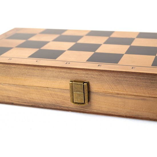 Складная деревянная шахматная доска сделана с использованием хорошей фурнитуры. Игровое поле тщательно отшлифовано и его половинки хорошо стыкуются с минимальным зазором. Размер шахматной доски в разложенном виде- 365мм х 365 мм. Игровое поле с четкой контрастной разметкой: темные клетки и надписи - черные, светлые клетки сохраняют цвет и фактуру натурального дерева. Размер шахматной клетки -40 мм.