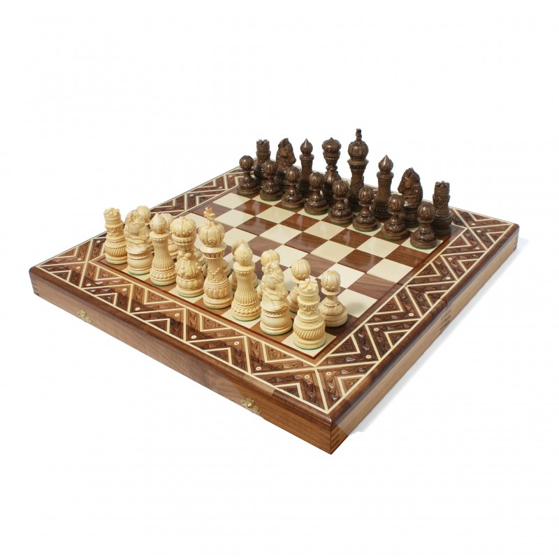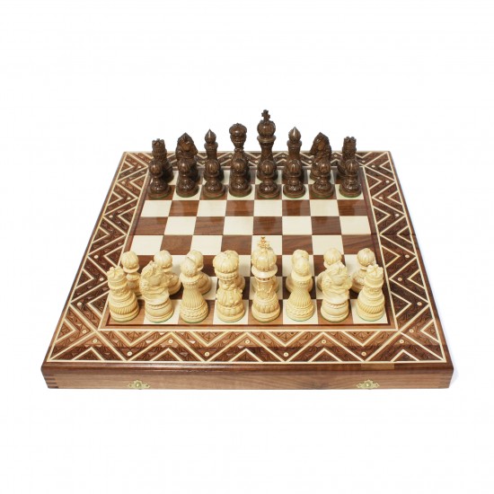 Доска изготовлена из натурального ореха, украшена изящной резьбой, что подчеркивает естественную красоту дерева. Фигуры вырезаны вручную из явора – прочной породы дерева. Их дизайн вдохновлен бутоном цветка лотоса: грациозные, гармоничные, уникальные в каждом штрихе. Многослойное покрытие лаком придает изделию глубокий блеск и защищает от износа.