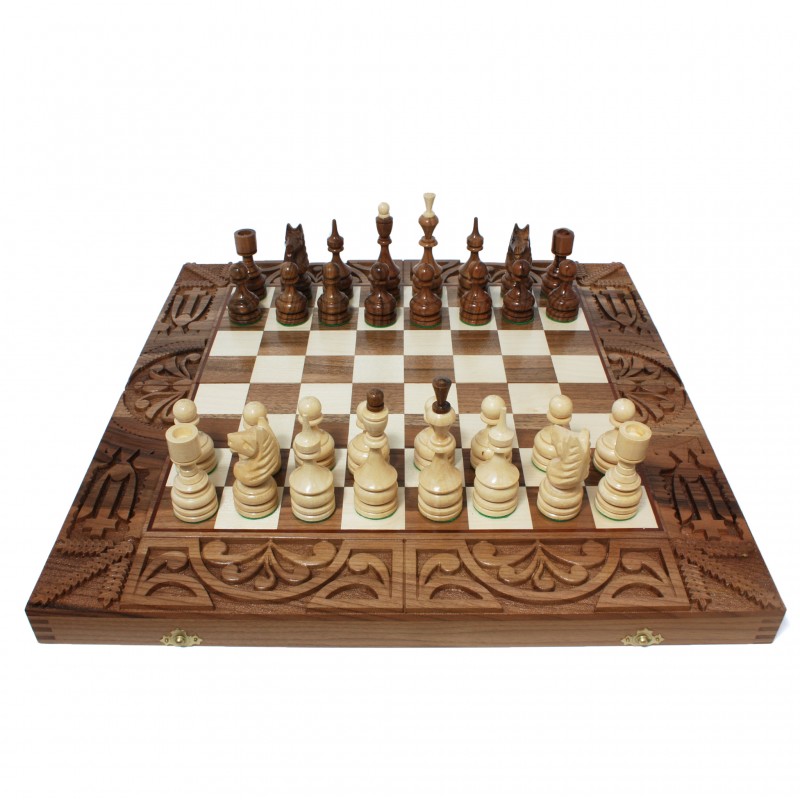 Доска украшена изящной резьбой, которая придает набору уникального характера и делает его настоящим украшением любого интерьера. Как доска, так и игровые фигуры покрыты многослойным лаком – это защищает дерево от повреждений и подчеркивает естественную текстуру материала. Доска изготовлена из ореха, светлые фигуры – явор, темные – орех.