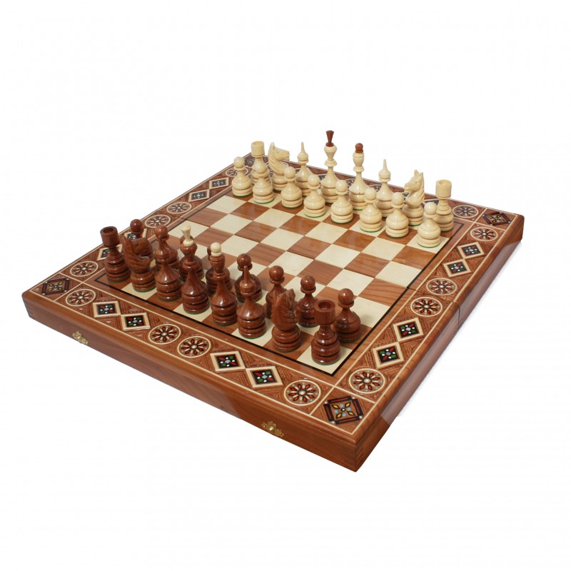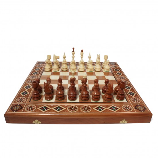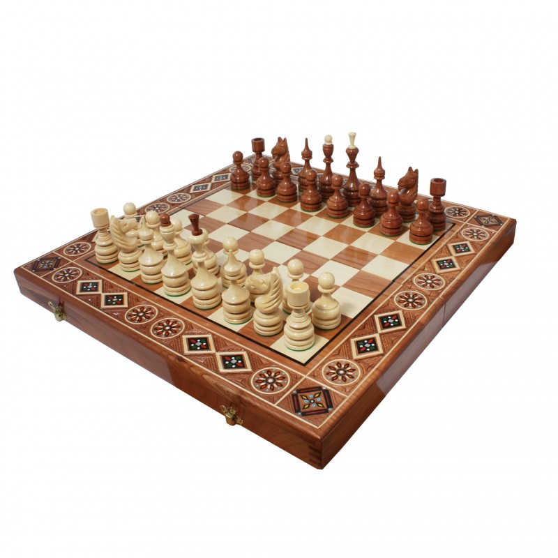 Игровая доска изготовлена вручную из натурального дерева черешня и украшена елементами выжигания в стиле вышиванки — с традиционными орнаментами, несущими глубокий смысл и эстетику. Доска складывется, образуя компактную шкатулку для хранения фигур. Шахматные фигуры – в классическом элегантном стиле, изготовленные из дерева (светлые фигуры – явор, темные – орех). Многослойная лакировка придает изделию глубокий блеск и защищает от износа.
