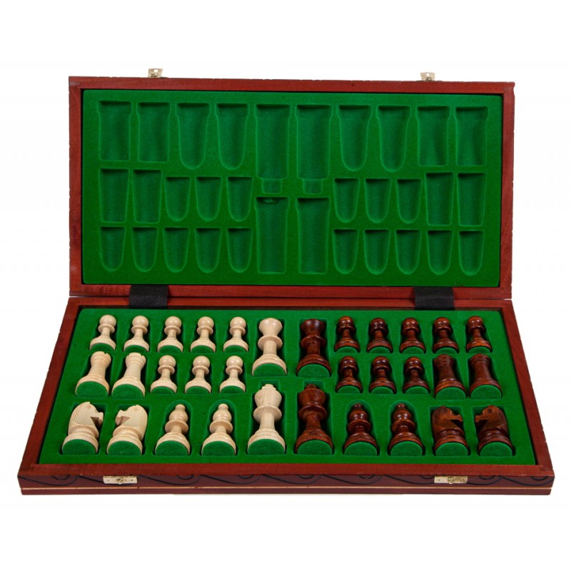 Еще раз польский производитель игровых шахмат Madon, подтвердил высокий профессионализм и европейское качество продукции, представив комплект под названием Consul. Шахматная доска изготовлена из натурального дерева бук и березы, и украшена оригинальной резьбой с элементами выжигания. Она легко складывается и превращается в удобный контейнер для хранения фигур. Фигуры в свою очередь изготовлены из натурального дерева- граб, и дополнительно укомплектованы бархатной подкладкой, которая исключает повреждение доски во время игры. Фигуры выполнены в классическом стиле Стаунтона.