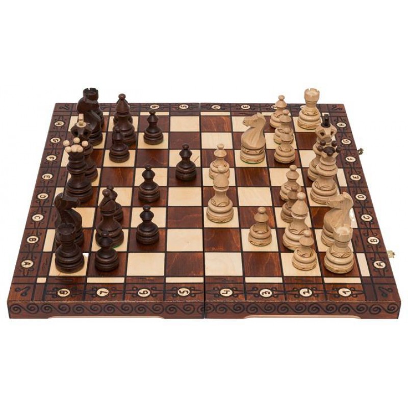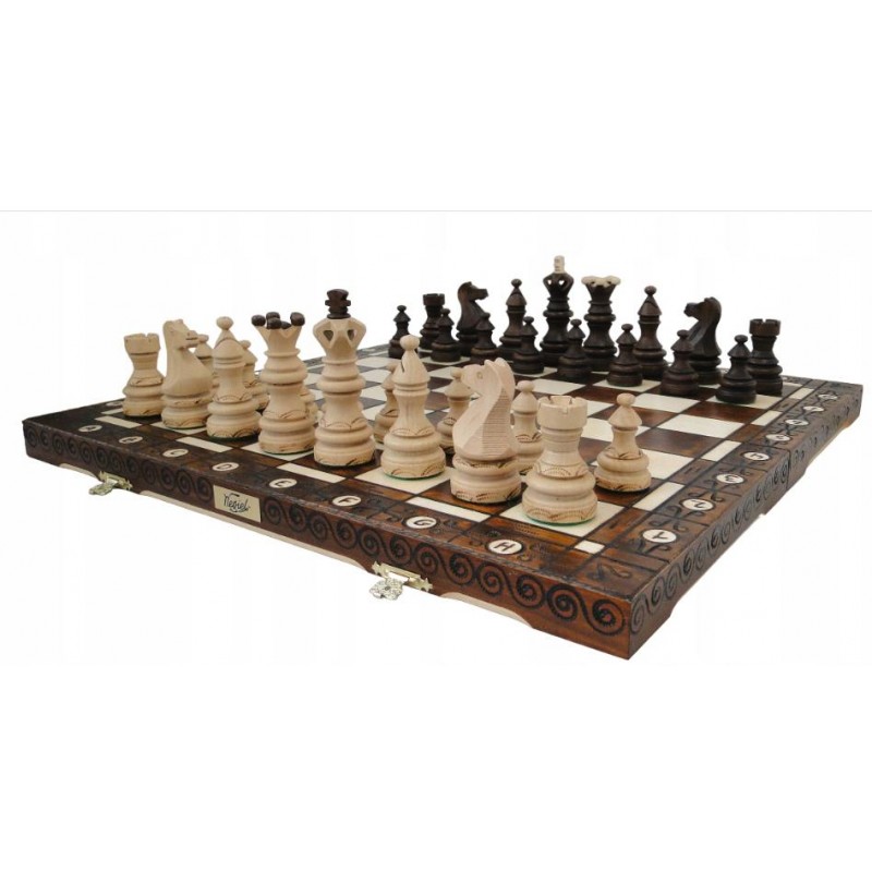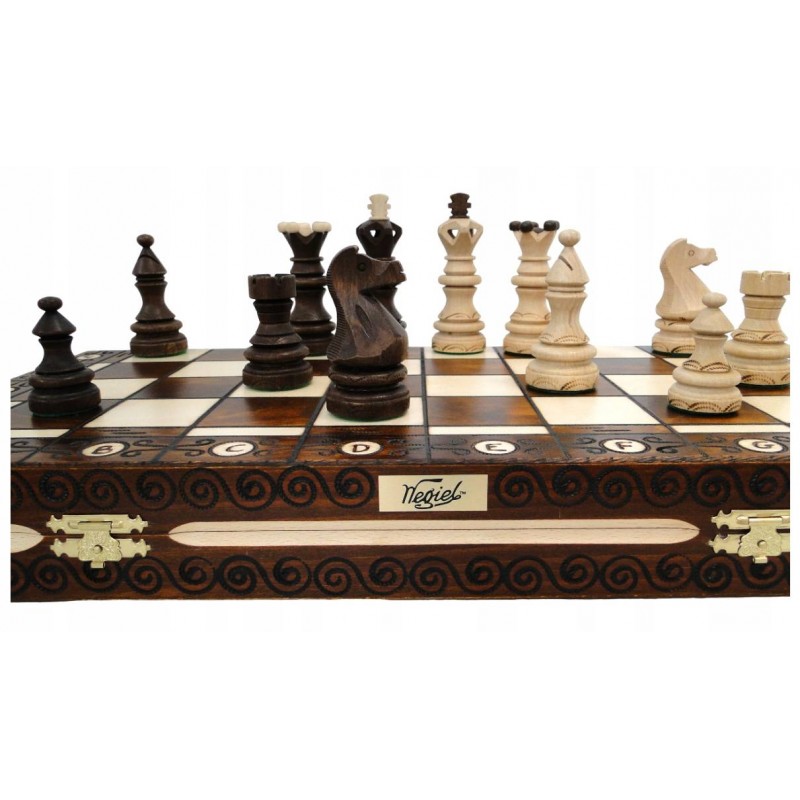 Оригинальный шахматный набор Император- ручная работа польских мастеров, известного бренда премиум-сегмента Wegiel. Шахматная доска изготовлена из бука и березы, фигуры- из платана и граба. Доска искусно вырезана, с элементами выжигания.