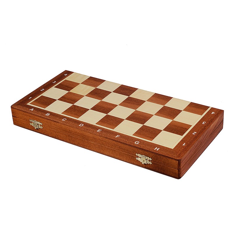 Шахматная доска выполнена в технике инкрустации красного дерева и платана, что создает контрастное и красивое поле для игры. Внутренняя часть доски оснащена индивидуальными ячейками для хранения каждой фигуры.