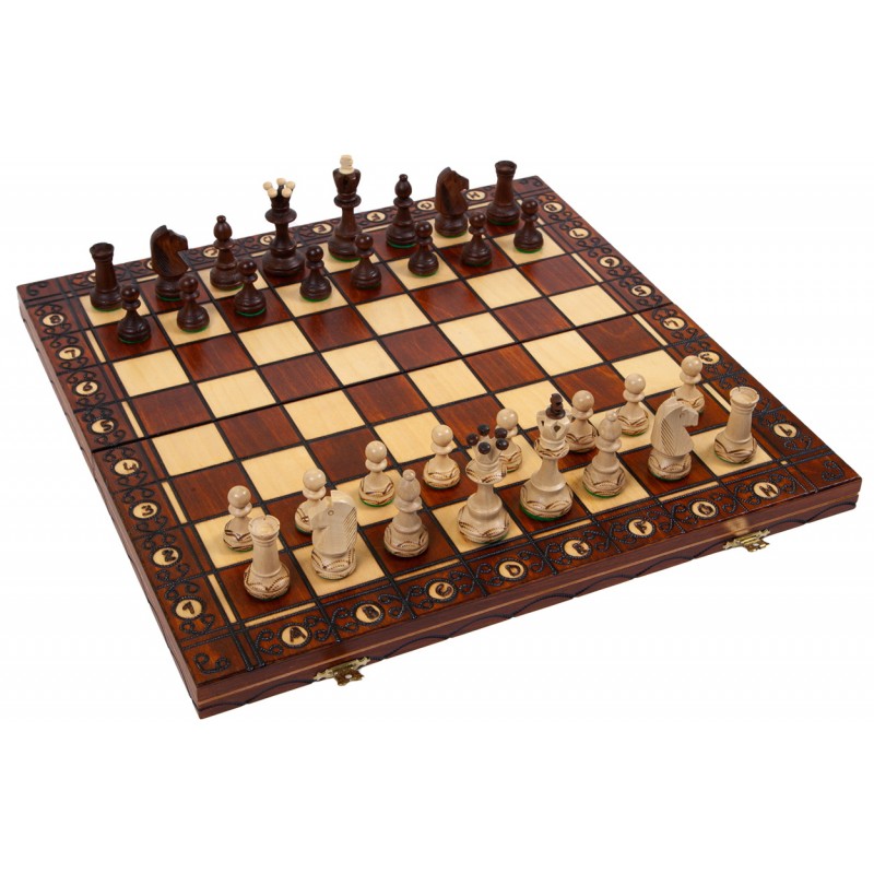 Шахматный набор Senator, от польского производителя Wegiel, отличается оригинальным дизайном доски и фигур. Фигуры выполнены из высококачественной древесины (граб и платан) с элементами выжигания, тщательно отшлифованы и покрыты многослойным лаком. Доска сделана из древесины бука и березы, с элементами ручной резьбы и выжигания и имеет соответствующую разметку. Доска легко складывается и превращается в удобный контейнер для хранения фигур, что обеспечивает их целостность при транспортировке. В сложенном виде, доска надежно закрывается с помощью двух латунных застежек. Основание фигур покрыто войлоком, что предотвращает повреждение уникальной игровой доски во время игры. Фигуры с дополнительным утяжелителем.