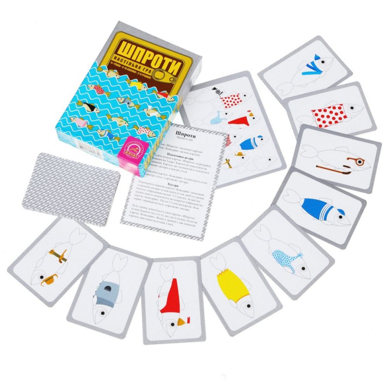 Шпроти — це дитяча гра в карти, що розвиває спостережливість та пам’ять. В грі є 2 типи карток — «Консерви» та «Риби». Картки «Риби» беруть гравці, а картки «Консерви» кладуться «сорочкою» догори посередині. Картка «Консерва» перевертається на декілька секунд. За цей час треба запам’ятати найбільше видів риб, що на ній зображені, та викласти свої картки з відповідними рибами. За помилково викладену картку (якої не було в «Консерві») штрафують.